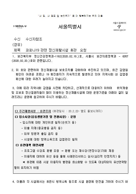 소식/코로나19(COVID-19) 관련 [긴급공지] 코로나 바이러스로 인한 휴관 안내 태화샘솟는집 2020. 2. 24. 08:01 코로나 바이러스로 인해 당분관 휴관합니다. 기간: 2월 22일 ~ 별도 통보시까지 이용에 참고바랍니다! 공유하기 게시글 관리 태화샘솟는집 저작자표시 비영리 변경금지 (새창열림) '소식 > 코로나19(COVID-19) 관련' 카테고리의 다른 글 [코로나19 관련 문용훈 관장 메시지3] ‘태화샘솟는집은 전통적인 공동체 활동과 가상공간의(virtual) 공동체 활동이 공존합니다’ (0) 2020.04.08 [코로나19 관련 문용훈 관장 메시지2] 태화샘솟는집은 문을 닫지 않았습니다. 또 하나의 태화샘솟는집이 운영되고 있습니다. (0) 2020.04.02 [코로나19 관련 문용훈 관장 메시지] ‘그 사람이 거기에 있다는 것을 알아주는 태화샘솟는집의 첫번째 변신’ (0) 2020.03.24 매일 코로나확산 방지를 위해 노력하는 샘집 공동체를 응원합니다! (0) 2020.03.23 코로나19(COVID-19) 확산 방지를 위한 예방수칙 (0) 2020.03.23 '소식/코로나19(COVID-19) 관련' Related Articles [코로나19 관련 문용훈 관장 메시지2] 태화샘솟는집은 문을 닫지 않았습니다. 또 하나의 태화샘솟는집이 운영되고 있습니다. [코로나19 관련 문용훈 관장 메시지] ‘그 사람이 거기에 있다는 것을 알아주는 태화샘솟는집의 첫번째 변신’ 매일 코로나확산 방지를 위해 노력하는 샘집 공동체를 응원합니다! 코로나19(COVID-19) 확산 방지를 위한 예방수칙