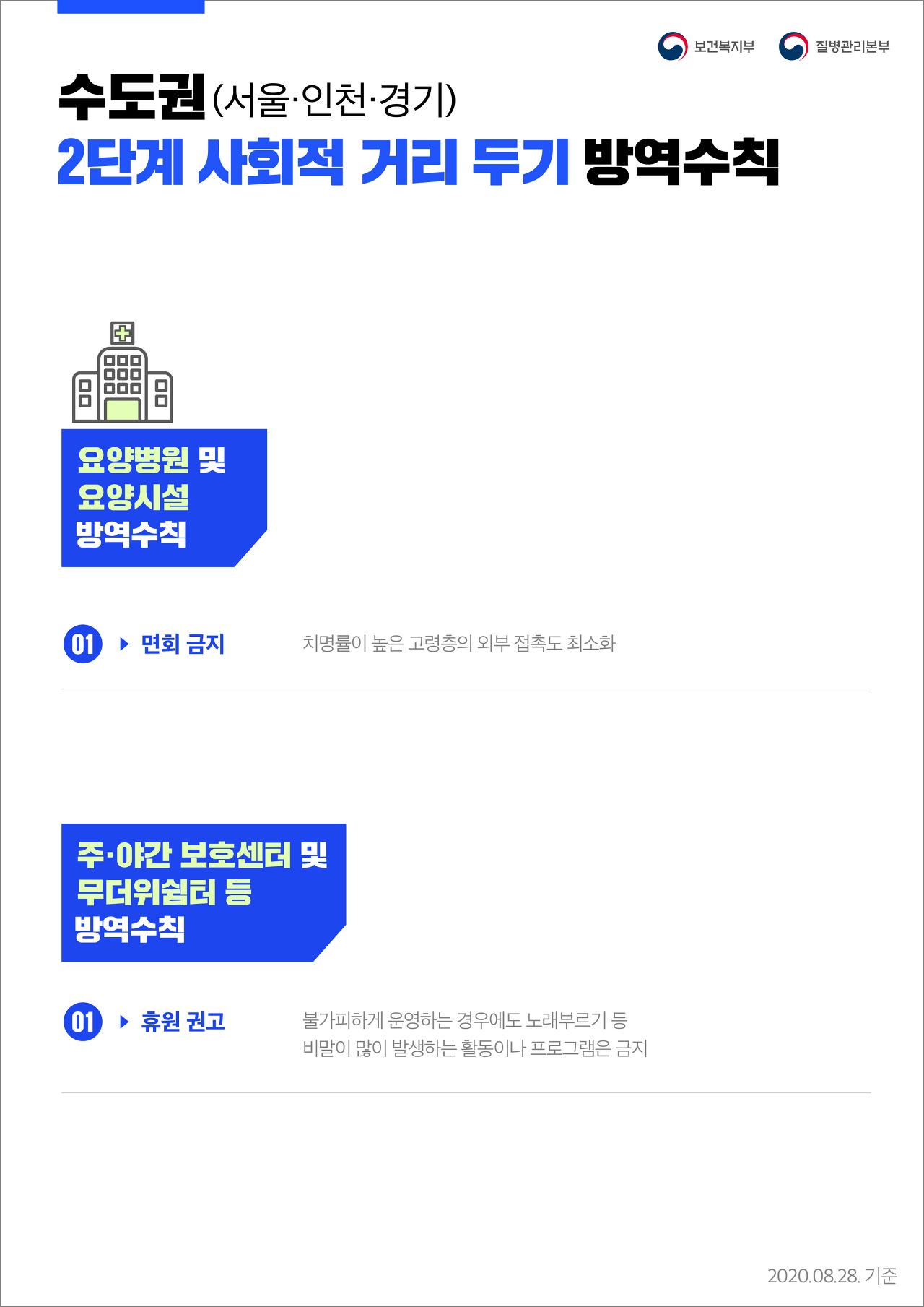 소식/코로나19(COVID-19) 관련 수도권 2단계 사회적 거리두기에 따른 방역수칙 안내 태화샘솟는집 2020. 9. 1. 13:47 공유하기 게시글 관리 태화샘솟는집 저작자표시 비영리 변경금지 (새창열림) '소식 > 코로나19(COVID-19) 관련' 카테고리의 다른 글 코로나-19 상황에서 지켜야할 샘집 수칙 (0) 2021.02.18 마스크 착용 의무화 안내 (0) 2020.11.13 [코로나19 관련 문용훈 관장 메시지4] "태화샘솟는집의 두 공간은 '함께 만들고 경험'하고 있습니다." (0) 2020.06.17 코로나-19에 대처하는 태화샘솟는집 (0) 2020.05.25 [후원홍보부] 코로나 재난 지원금 안내 (0) 2020.04.22 '소식/코로나19(COVID-19) 관련' Related Articles 코로나-19 상황에서 지켜야할 샘집 수칙 마스크 착용 의무화 안내 [코로나19 관련 문용훈 관장 메시지4] "태화샘솟는집의 두 공간은 '함께 만들고 경험'하고 있습니다." 코로나-19에 대처하는 태화샘솟는집