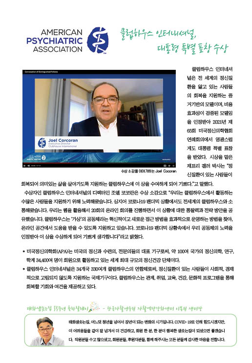 참여하기/Clubhouse International 클럽하우스 인터내셔널, 대통령 특별 표창 수상 태화샘솟는집 2021. 6. 24. 14:19 공유하기 게시글 관리 태화샘솟는집 저작자표시 비영리 변경금지 (새창열림) '참여하기 > Clubhouse International' 카테고리의 다른 글 "샘집 지화자~!" 샘집을 세계에 알리다 - 전재현 관장님 인터뷰 (1) 2025.06.10 [클럽하우스 인터내셔널] 2021년 미국정신의학협회 주관 대통령 특별 표창 수상 (0) 2021.05.14 Clubhouse International 국제 클럽하우스 연맹 (0) 2015.08.07 '참여하기/Clubhouse International' Related Articles "샘집 지화자~!" 샘집을 세계에 알리다 - 전재현 관장님 인터뷰 [클럽하우스 인터내셔널] 2021년 미국정신의학협회 주관 대통령 특별 표창 수상 Clubhouse International 국제 클럽하우스 연맹