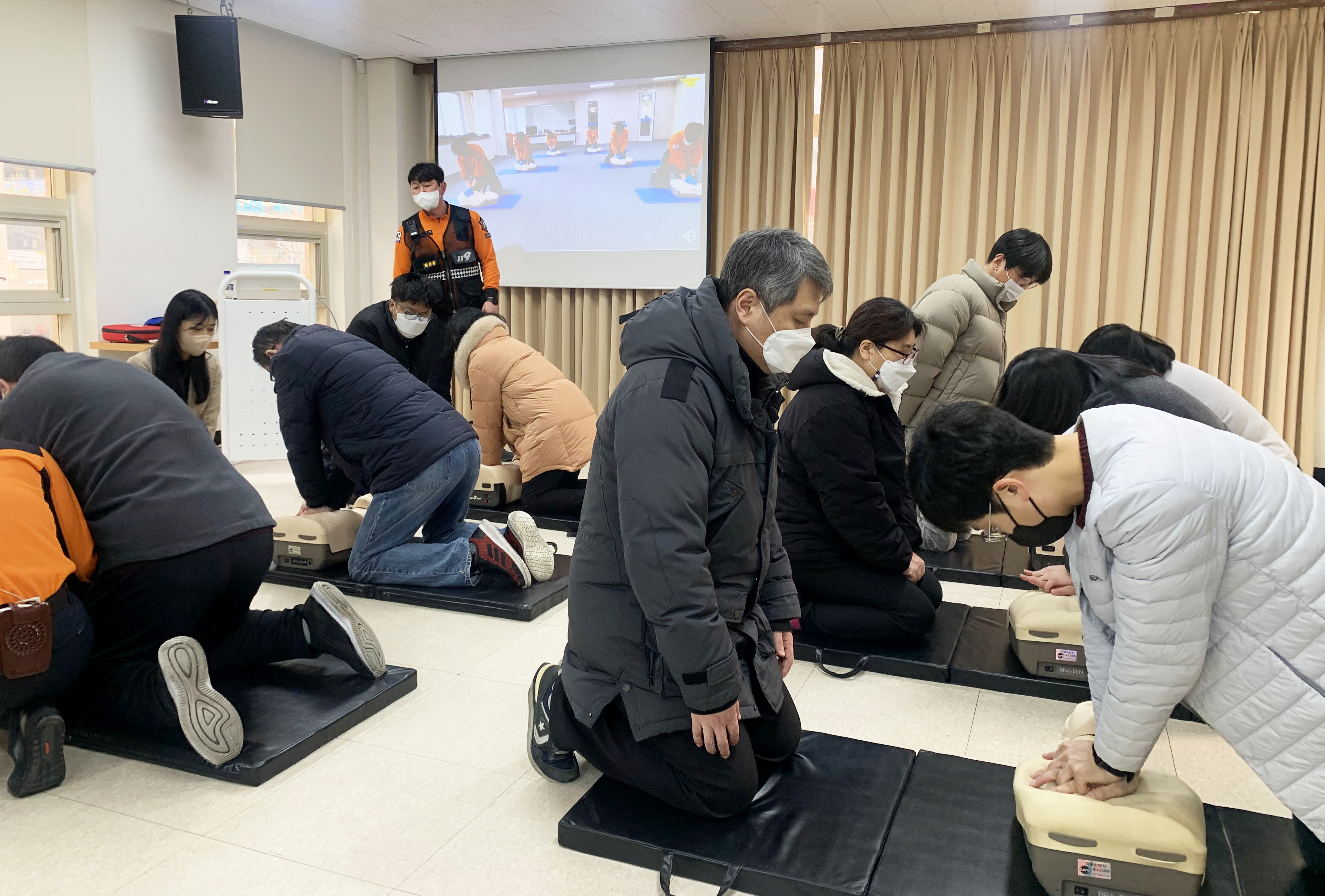 이야기/취미, 교육이야기 '아는 것이 힘'인, 응급처치교육 태화샘솟는집 2023. 3. 2. 16:22 실제로 경험하며 배우는 응급처치교육 2월 7일, 마포소방서 교육홍보팀과 함께하는 응급처치교육이 진행되었습니다. 심뇌혈관 질환 발생 확률이 높은 추운 겨울, 골든 타임을 놓지치 않고 위급한 사람을 살릴 수 있는 응급처치 방법(심폐소생술, 자동심장충격기 사용법)에 대해서 배우고 실습해볼 수 있었습니다. 심폐소생술, 왜 중요한가요? 쓰러진 사람을 발견하면, 4분 안에 응급처치를 수행해야 합니다. 4분이 지나면 뇌사 상태가 될 수 있기 때문입니다. 심폐소생술은 심장과 폐의 기능이 정지되었을 때, 인공적으로 심장을 압박하여 뇌로 산소가 공급되게 하는 응급처치법입니다. 심폐소생술은 의식과 호흡이 없을 때, 비정상적이고 규칙적이지 않은 호흡을 할 때, 심정지 경련이 발생한 상황에서 수행합니다. 심폐소생술, 순서대로 진행하세요 첫째, 환자의 안정을 확인합니다. 환자가 쓰러진 곳에 외부의 다른 위험이 없는지 확인합니다. 둘째, 의식을 확인합니다. 환자의 양쪽 어깨를 두드리며 말을 겁니다. 어깨를 두드리는 이유는 척추 혹인 경추에 손상이 있을 수 있기 떄문입니다. 섯째, 주변에 도움을 청하여 119에 신고하고, 자동심장충격기를 요청합니다. 도움을 청할 떄, 가장 중요한 것은 인상착의를 특정하여 정확하게 지명하는 것입니다. 만약 주변에 도움을 청할 수 없다면 119에 신고한 후 스피커폰으로 전환하여 소방관의 지시에 따릅니다. 넷째, 호흡을 확인합니다. 얼굴과 입술색 가슴과 배의 규칙적인 오르내림을 확인합니다. 다섯째 심폐소생술을 진행합니다. 가슴뼈의 1/2지점, 겨드랑이 선을 따라 명치를 압박합니다. 환자 옆에 어깨 너비로 무릎을 벌려 끓어 앉은 후, 두 손을 포갠 뒤 깍지를 끼어 팔꿈치를 곧게 펴고 가슴 압박을 시행합니다. 측면에서 봤을 때 수직 방향이 되도록 합니다. 압박의 깊이는 5~6cm 압박 속도는 분당 100~120회 정도로 시행합니다. 응급처치교육, 어땠나요?_ 전준우씨 여러 사람의 생명을 구할 수 있는 처치법을 배워서 유익한 교육이었어요. 마네킹으로 현장감 있는 실습까지 하고 나니 더욱 와닿았던 것 같아요. 특히 골든 타임을 놓치지 않고 침착하게 처치해야 한다는 것을 배울 수 있었어요. 응급처치교육을 듣지 않았다면, 언제 어디서나 쓰러져 있는 사람을 본다면 곧바로 처치할 수 있을것 같아요. 그리고 교육을 듣고 나니, 샘솟는집 입구에 비치된 자동심장충격기가 눈에 띄었어요. 그동안 주의 깊게 본 적이 없었는데, 앞으로 위급한 상황이 생긴다면 용기있게 처치할 수 있을 것 같아요. 샘솟는집에 오셔서 좋은 교육 해주신 소방관분들에게도 감사합니다. 공유하기 게시글 관리 태화샘솟는집 저작자표시 비영리 변경금지 (새창열림) '이야기 > 취미, 교육이야기' 카테고리의 다른 글 고립 청년의 선순환, 회복스카우트 사업 (1) 2023.08.31 연대하며 성장하는 샘집의 MZ세대 (0) 2023.06.09 “감사를 통해 마음의 기쁨을 누립니다.” (0) 2022.12.27 샘대 학생회, 그들은 누구인가? (0) 2022.10.28 여름을 알차게! ‘여름샘집학교’ 개강 (0) 2022.08.05 '이야기/취미, 교육이야기' Related Articles 고립 청년의 선순환, 회복스카우트 사업 연대하며 성장하는 샘집의 MZ세대 “감사를 통해 마음의 기쁨을 누립니다.” 샘대 학생회, 그들은 누구인가?