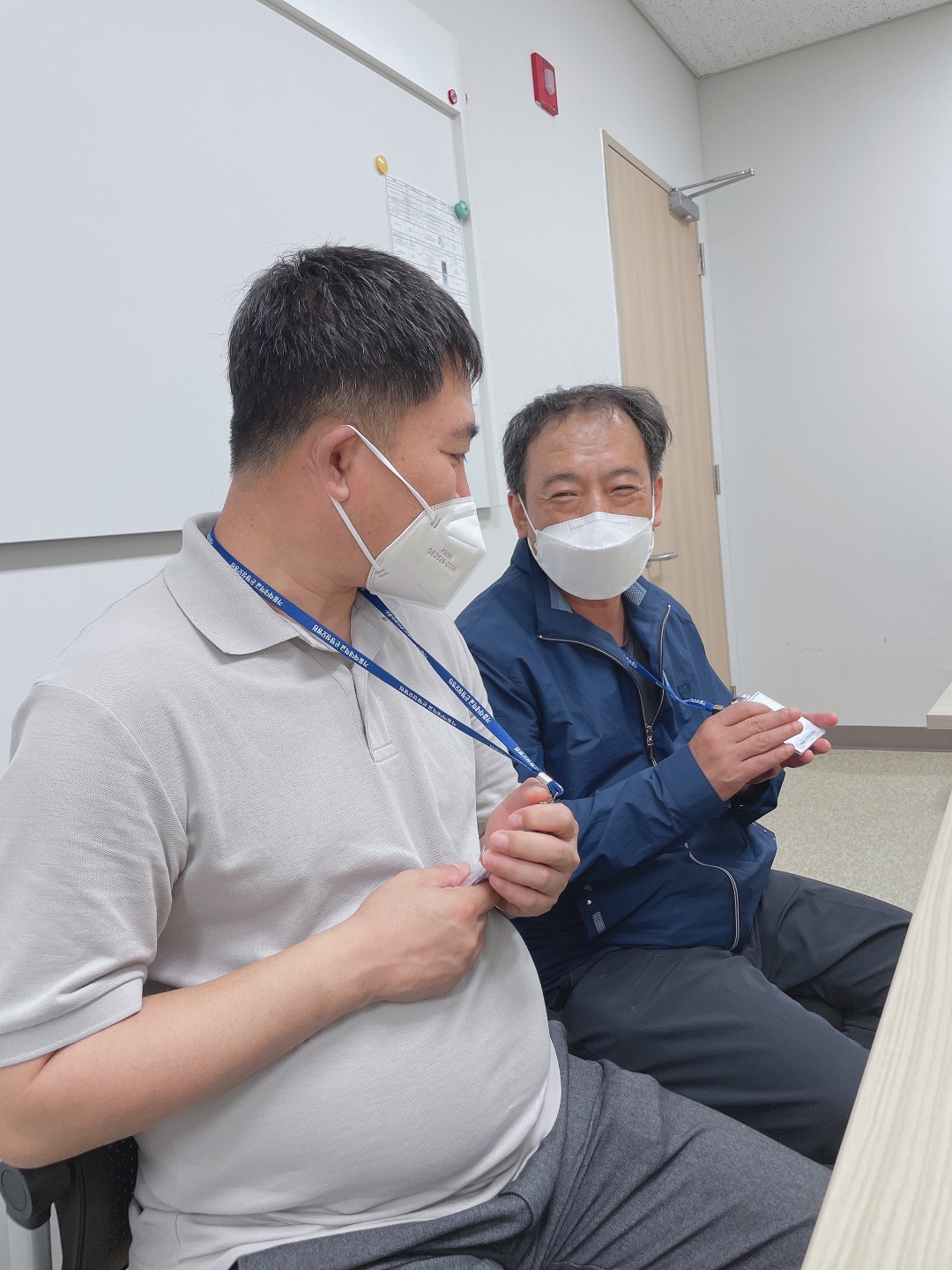 입사 첫날, 사원증을 받고 기뻐하는 한상웅씨(우)