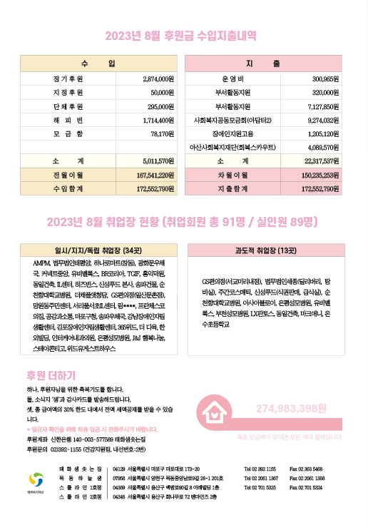후원/후원보고 2023년 8월 후원보고 태화샘솟는집 2023. 12. 13. 08:50 공유하기 게시글 관리 태화샘솟는집 저작자표시 비영리 변경금지 (새창열림) '후원 > 후원보고' 카테고리의 다른 글 2023년 10월 후원보고 (0) 2023.12.13 2023년 9월 후원보고 (0) 2023.12.13 2023년 7월 후원보고 (0) 2023.08.31 2021년 후원금 통계 (0) 2022.02.08 2019년 특별후원모금 [2019 중년들의 건강한 노년 만들기] 보고 (0) 2019.08.13 '후원/후원보고' Related Articles 2023년 10월 후원보고 2023년 9월 후원보고 2023년 7월 후원보고 2021년 후원금 통계