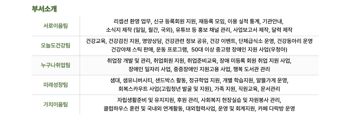 태화샘솟는집에는 5개의 팀이있으며, 각 팀에서 하루씩 경험한 후 원하는 팀에 등록할 수 있습니다.