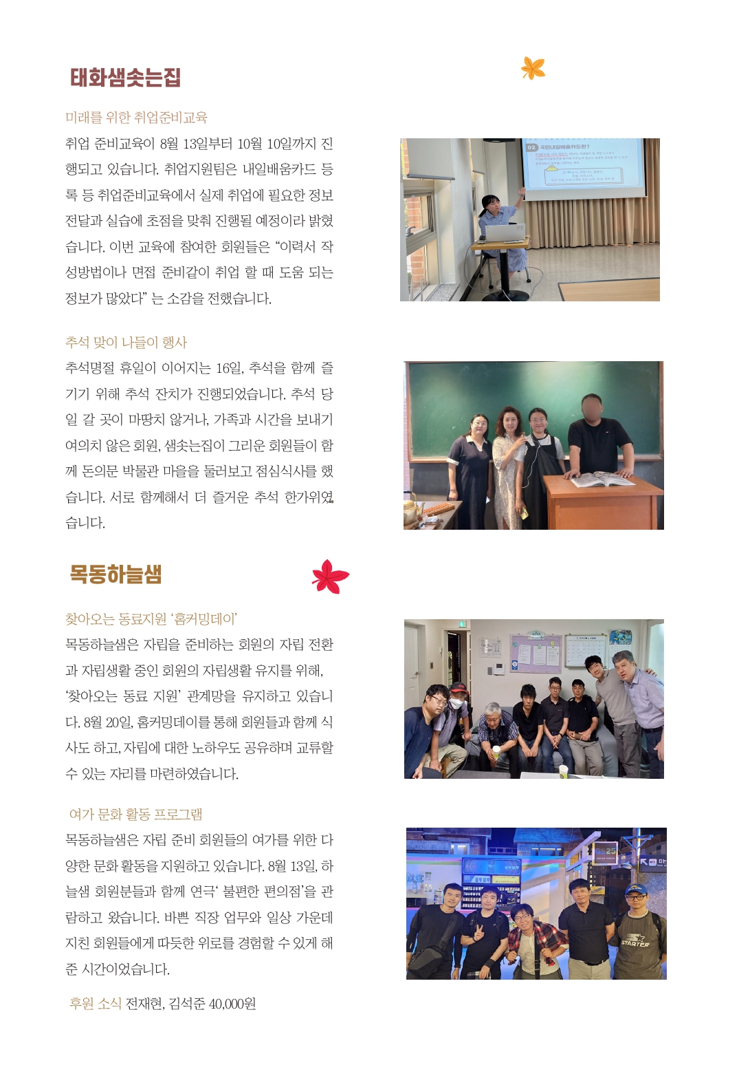 소식/샘집X산하기관 9월 목동하늘샘 소식 태화샘솟는집 2024. 9. 24. 15:41 공유하기 게시글 관리 태화샘솟는집 저작자표시 비영리 변경금지 (새창열림) '소식 > 샘집X산하기관' 카테고리의 다른 글 "초심을 잃지 않고 따뜻한 공동체를 만들고 싶어요." - 전재현 관장 인터뷰 (0) 2025.02.06 2024년 12월 태화샘솟는집, 스롤라인 소식 (0) 2025.01.02 7월 목동하늘샘 소식 (0) 2024.07.31 2024년 6월 스롤라인 소식 (0) 2024.07.08 2024년 5월 목동하늘샘 소식 (0) 2024.05.30 '소식/샘집X산하기관' Related Articles "초심을 잃지 않고 따뜻한 공동체를 만들고 싶어요." - 전재현 관장 인터뷰 2024년 12월 태화샘솟는집, 스롤라인 소식 7월 목동하늘샘 소식 2024년 6월 스롤라인 소식
