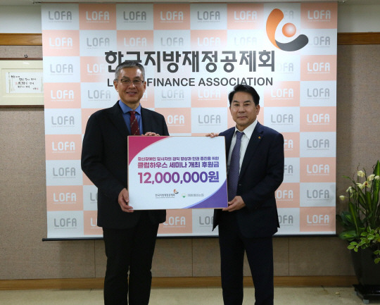 이인재(사진 오른쪽) 한국지방재정공제회 이사장과 문용훈(〃 왼쪽) 태화샘솟는집 관장이 지난 5일 재정공제회 14층 회의실에서 열린 태화샘솟는집 후원금 전달식에서 기념 촬영을 하고 있다.