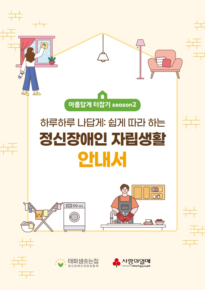 자료실/자료실 [아름답게터잡기 시즌2/PDF] 하루하루 나답게: 쉽게 따라 하는 정신장애인 자립생활 안내서 태화샘솟는집 2025. 8. 1. 08:59 본 욕구사정 가이드북은 '아름답게 터잡기 season 2' 사업의 일환으로 사회복지공동모금회의 지원을 받아 제작하였습니다. 자립생활 안내서를 사용하실 때는 반드시 출처를 밝혀 주시길 바랍니다. 태화샘솟는집-하루하루 나답게 쉽게 따라 하는 정신장애인 자립생활 안내서(웹).pdf 5.87MB 공유하기 게시글 관리 태화샘솟는집 저작자표시 비영리 변경금지 (새창열림) '자료실 > 자료실' 카테고리의 다른 글 [청년 회복스카우트/PDF] 사회적고립 청년정신장애인 지원 기관 실무자를 위한 가이드북 (0) 2025.07.25 클럽하우스 소개 리플렛 (0) 2024.11.19 [아름답게터잡기 시즌2/PDF] 지역사회 정신장애인 지원하기 [사정 양식 활용편] (0) 2024.08.22 [아름답게터잡기 시즌2/PDF] 자립준비교육 매뉴얼(교육자용) (0) 2024.07.11 <태화샘솟는집> 개인정보 처리방침 (0) 2024.07.09 '자료실/자료실' Related Articles [청년 회복스카우트/PDF] 사회적고립 청년정신장애인 지원 기관 실무자를 위한 가이드북 클럽하우스 소개 리플렛 [아름답게터잡기 시즌2/PDF] 지역사회 정신장애인 지원하기 [사정 양식 활용편] [아름답게터잡기 시즌2/PDF] 자립준비교육 매뉴얼(교육자용)
