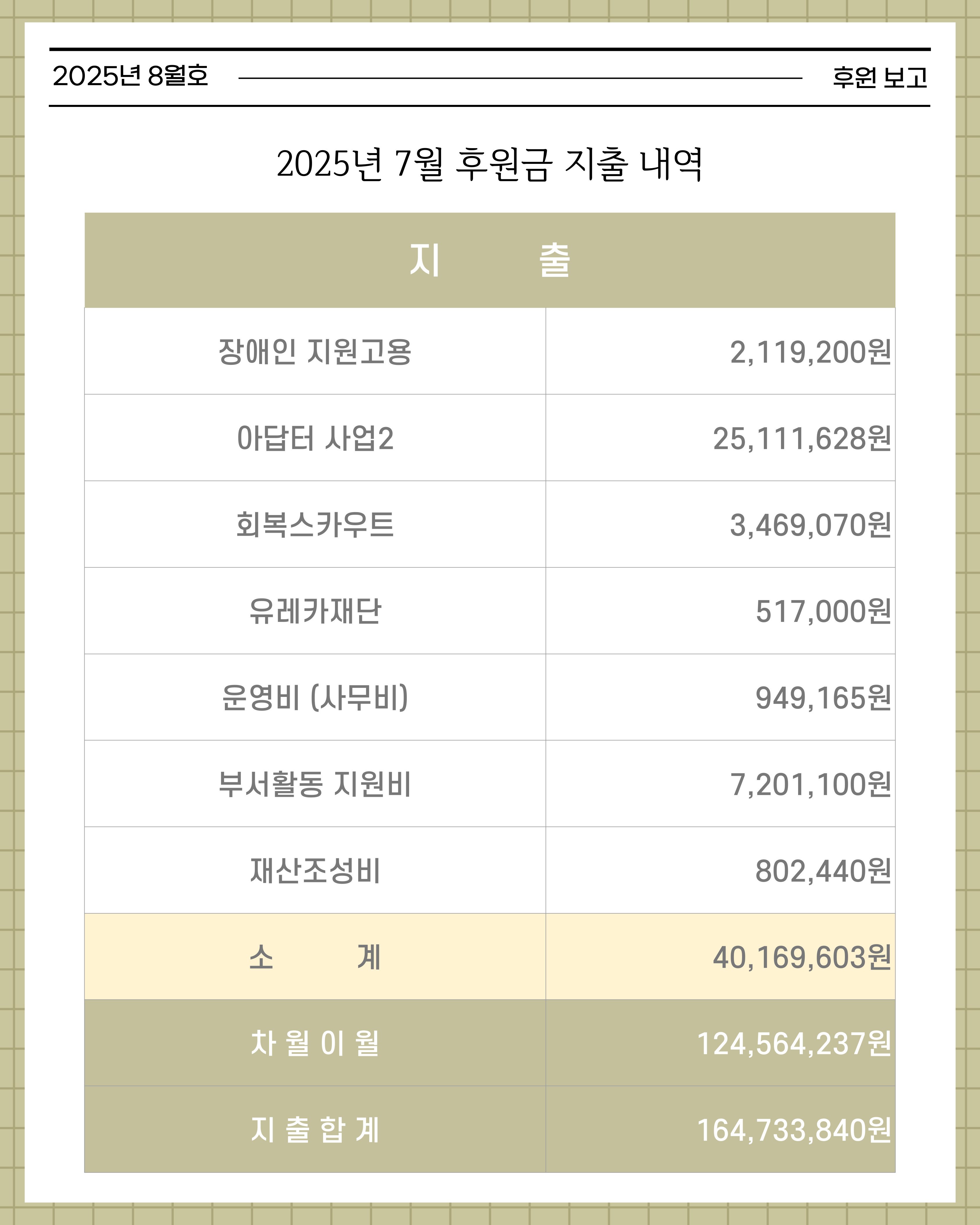 후원/후원보고 2025년 7월 후원보고 태화샘솟는집 2025. 8. 25. 11:20 공유하기 게시글 관리 태화샘솟는집 저작자표시 비영리 변경금지 (새창열림) '후원 > 후원보고' 카테고리의 다른 글 2025년 6월 후원보고 (0) 2025.08.06 2025년 5월 후원 보고 (0) 2025.07.08 2025년 4월 후원보고 (0) 2025.06.10 2025년 3월 후원보고 (0) 2025.04.22 2025년 2월 후원 보고 (0) 2025.04.14 '후원/후원보고' Related Articles 2025년 6월 후원보고 2025년 5월 후원 보고 2025년 4월 후원보고 2025년 3월 후원보고