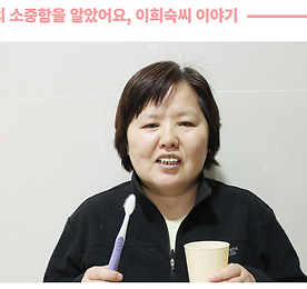 이야기 썸네일형 리스트형 도전하는 과정에서도 많은 것을 배웁니다, 허진행씨 이야기 1. 방송통신대를 다니게 된 계기가 있나요? 나의 내면을 들여다보고 나를 더 이해하고 싶었다. 이와 관련된 공부를 하는 것이 도움될 것으로 생각해서 방송통신대학교(이하 방통대)에 진학하기로 했다. 평소 대인관계에 대한 부담이 있었는데 방통대는 이런 부분에 대한 어려움이 없어서 선택하게 되었다. 원래는 사회복지학과를 가려고 했는데 방통대에는 사회복지학과가 없었다. 교육학과에 사회복지학, 심리학 과목이 포함되어서 교육학과에 진학하게 되었다. 2. 공부하면서 힘든 점은 없었나요? 어떻게 이겨내고 있나요? 집중이 잘 안 되고, 책을 봐도 뒤의 내용을 보면 앞의 내용이 생각이 안났다. 자신감도 떨어지고 그만두고 싶은 적도 있었다. 4학년 과정을 다 끝내지 못할 것 같은 생각이 들었다. 그때마다 태화샘솟는집에 오면.. 더보기 알파고를 이기는 바둑교실 바둑의 매력에 빠지게 된 것은 초등학교 때로 기억한다. 아버지가 바둑을 두는 모습을 보고 관심을 가지게 되었다. 처음에는 바둑을 배울 곳이 없어서 책을 통해 독학으로 시작하였다. 독학으로 바둑을 배우는 것은 쉽지 않았지만, 여러 책도 보고 사활공부도 하면서 바둑 실력을 키워 나갔다. 초등학교 때부터 시작된 바둑에 대한 열정은 지금까지 이어졌다. 요즘도 부서업무를 끝낸 일과 외 시간에는 다른 회원들과 바둑대전을 하기도 하면서 바둑에 대한 끈을 놓지 않고 지내왔다. 그러던 중 부서 직원으로부터 ‘바둑 프로그램’을 진행하는 것에 대한 제안을 듣게 되었고, 흥미롭고 재미있을 것 같았다. 지금은 매주 수요일 12시40분 부터 약 30분 가량 다른 회원들을 대상으로 바둑 프로그램을 진행하고 있다. 여러 명이 참여할.. 더보기 치아관리의 소중함. 이희숙씨 이야기 태화샘솟는집에서는 올해 1월과 4월, 서울시 장애인치과병원과 함께 구강 검진, 구강 보건 교육을 진행하였고 회원들이 건강한 치아로 보다 더 행복한 삶을 살 수 있도록 지원하였다. 그 중 구강 검진과 구강 보건 교육을 통해 치아 관리의 소중함을 깨닫게 되었다는 후원홍보부의 이희숙씨를 만나 그 이야기를 들어보았다. "의사가 그러는데, 치료를 안 받았으면 너무 이가 썩어서 큰일 날 뻔 했대요." 치통으로 고생을 한 지 꽤 오래 되었다. '언젠가 괜찮아 지겠지, 괜찮아 지겠지'하고 방치해 둔 치아의 상태는 점점 나빠졌다. 어느 날부터 연두부를 씹을 때 조차도 통증이 심했고 왼쪽 치아로는 음식을 전혀 씹지 못하게 되었다. 그러다가 태화샘솟는집에서 구강검진을 받을 수 있는 기회가 있다고 하여 검진을 받았는데, 충치.. 더보기 "내가 일어나는 모습을 보고 다른 사람도 일어날 수 있었으면" 이종호씨는 태화샘솟는집에서 ‘든든한 동료’로 불린다. 분리수거와 같은 궂은 일도 마다하지 않고, 다른 회원들의 건강을 위한 야채스틱 판매에도 앞서서 참여하여 동료들의 건강을 챙긴다. 태화샘솟는집에서의 일상을 소중히 여기던 이종호씨는 지난 2월 ‘죠스떡볶이 가산디지털단지역점’에서 일을 시작했다. “이전에 정신요양원에서 1년 6개월간 지냈어요. 태화샘솟는집에 와서 다시 시작한다는 마음으로, 지푸라기라도 잡는 심정으로 다녔어요. 부모님이 지금까지 살아오신 것처럼 사회인으로서 해야 할 일을 해나가고 싶다는 생각에 취업 신청도 하게 되었습니다.” 이종호씨는 죠스떡볶이에서 전단지 돌리기, 음식 재료 손질 등 전반적인 일들을 맡고 있다. “태화샘솟는집에 오기 전까지는 나와 같은 어려움을 겪고 있는 사람이 이렇게 많다.. 더보기 샘대를 통해 더 큰 미래를 꿈꿉니다. 출발의 계절인 봄에 샘대(Saem college)로 인생의 새 도약을 시작한 회원지원부 최승훈씨를 만나 이야기를 들어보았다. “샘대는 대학생활을 경험해 보지 못한 회원들이 간접적으로나마 대학생활을 체험해 볼 수 있다는 점에서 정말 좋은 프로그램이라는 생각이 들었어요. 3월부터 시작한다고 해서 주저 없이 신청하게 되었죠.” 인터뷰에서 만난 최승훈씨는 샘대에 대한 기대감으로 가득해 보였다. 평소 드럼과 영어에 관심이 많았던 최승훈씨에게 샘대는, 유익한 교육을 배울 수 있는 좋은 기회였다. 또 샘대를 통해서 드럼과 영어를 잘 배워서 실력을 늘리고, 실생활에도 활용하고 싶다는 목표도 가지게 되었다. 최승훈씨는 샘대에 입학한 회원들이 함께 가서 좋은 시간을 보내고 더 친해질 수 있는 MT가 가장 기대가 된다고 하.. 더보기 이전 1 ··· 32 33 34 35 36 37 38 다음