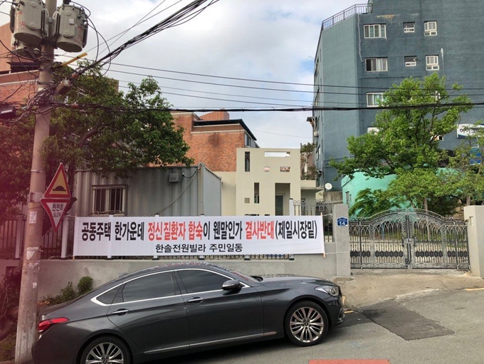 사회복지법인 나눔과행복이 부산 금곡동에 건립한 중증 정신질환자 공동생활가정 건물 앞에 지역주민들의 건립 반대 현수막이 붙어 있다.나눔과행복 제공