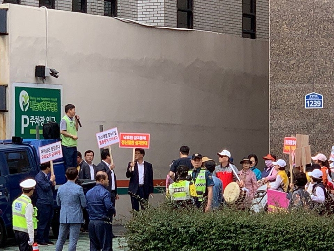 지난달 28일 정신질환을 치료하는 부산시 연제구 나눔과행복병원 앞에 부산시 금곡동 주민들과 부산 시의원, 구의원들이 모여 금곡동 중증 정신질환자 공동생활가정 운영을 반대하는 시위를 벌이고 있다. 나눔과 행복 제공