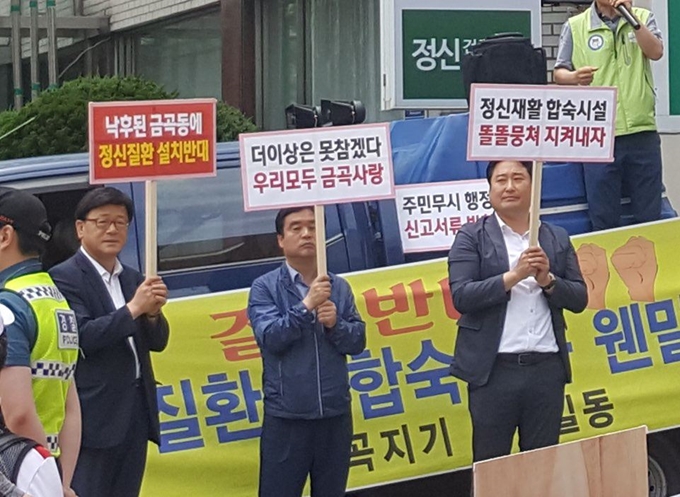 지난달 28일 정신질환을 치료하는 부산시 연제구 나눔과행복병원 앞에 부산시 금곡동 주민들과 부산 시의원 이동호(왼쪽부터) 구의원 김명석, 김성택이 모여 금곡동 중증 정신질환자 공동생활가정 운영을 반대하는 시위를 벌이고 있다. 나눔과행복 제공