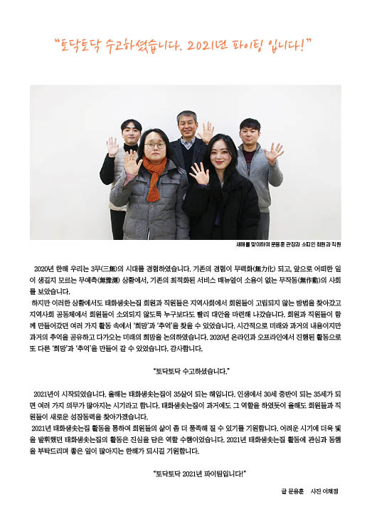 소식/샘집X산하기관 2021년 신축년 새해인사 태화샘솟는집 2021. 1. 25. 15:18 (소띠 회원과 직원, 좌측부터) 취업부 김두태씨, 취업부 실습생 노은서씨, 관장님, 건강지원팀 송정민씨, 건강지원팀 실습생 권오빈씨) 저작자표시 비영리 변경금지 (새창열림)