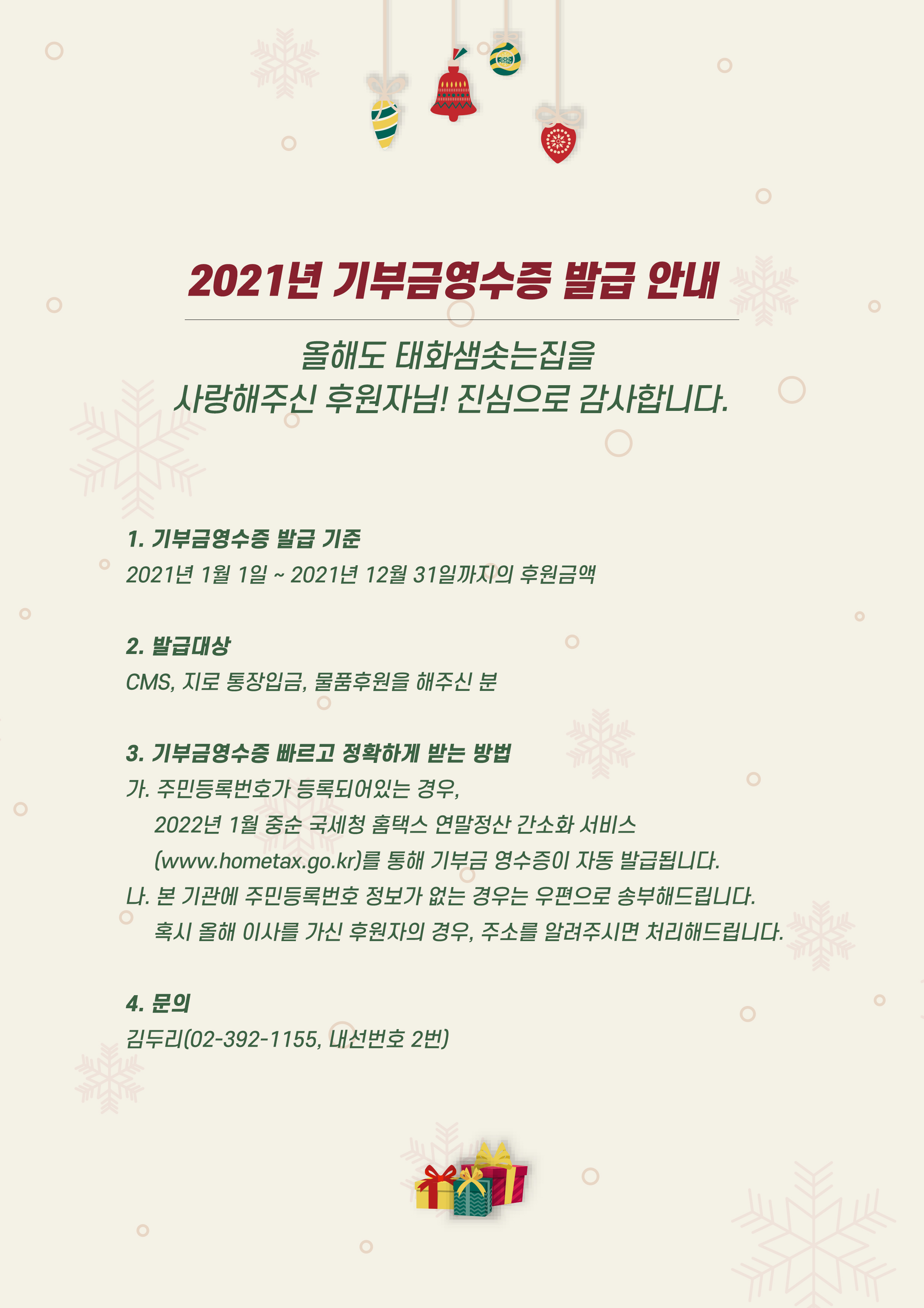 2. 발급기준: 1월 1일~12월 31일까지 입금된 후원금개인 후원자님이신 경우에는 매년 1월 15일 이후 국세청 연말정산간소화서비스(www.hometax.go.kr)를 통해서 후원내역 조회 및 출력할 수 있습니다. 주민등록번호가 기관에 등록되어 있지 않은 경우, 기부금영수증 발급을 원하실 경우, 02)392-1155 내선 2번으로 연락주시면 안내해드리겠습니다.