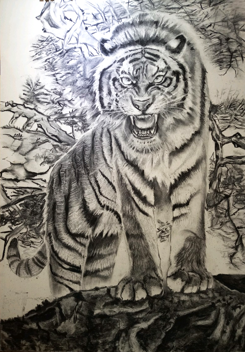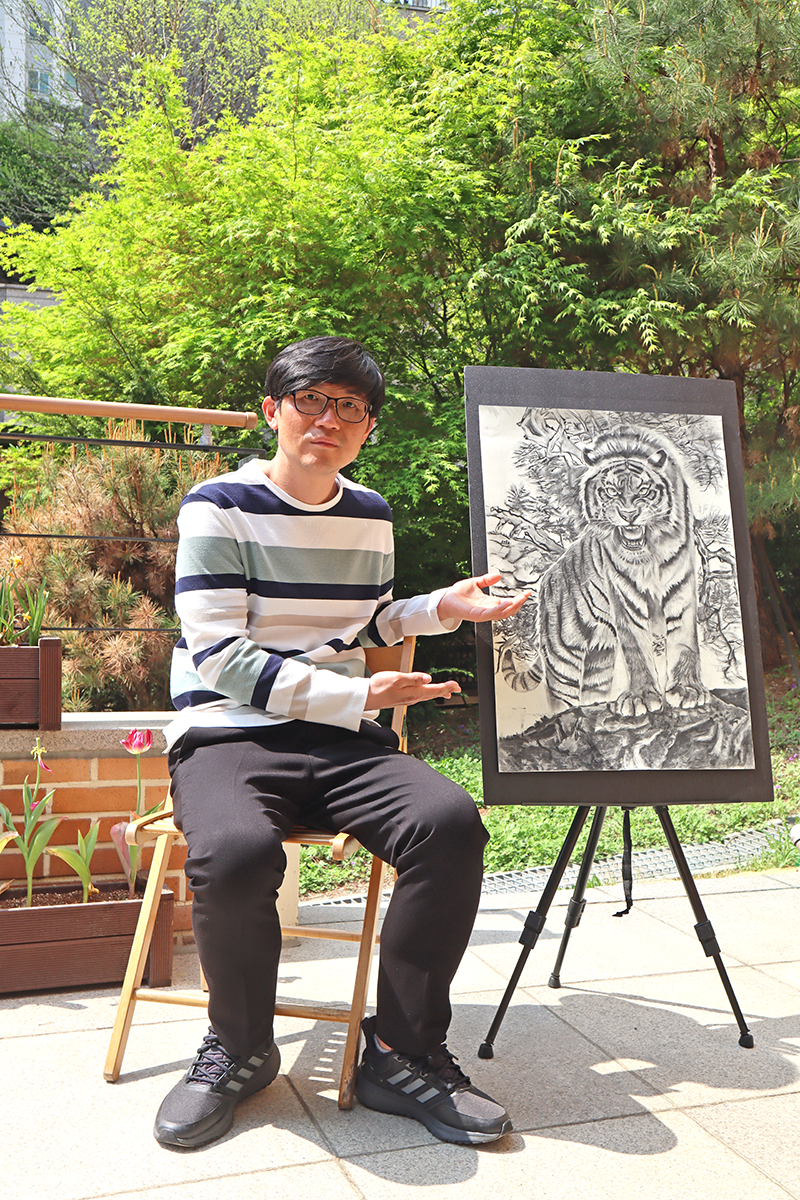 “호랑이의 모습이 가장 멋지다고 생각해요. 용감하고 기개있는 호랑이 사진을 보고 최대한 비슷하게 묘사했어요. 제가 그리는 그림의 60%가 호랑이의 모습인데, 호랑이가 귀신을 쫓는다는 이야기가 있어 액운을 막고자 하는 마음으로 그렸어요. 다음 작품은 호랑이가 눈보라 속을 물처럼 헤엄치듯이 다니는 모습을 그리고 싶어요. 눈보라 속을 헤치는 호랑이의 모습이 위엄있고 멋져서, 그림으로 표현해보려고요.”
