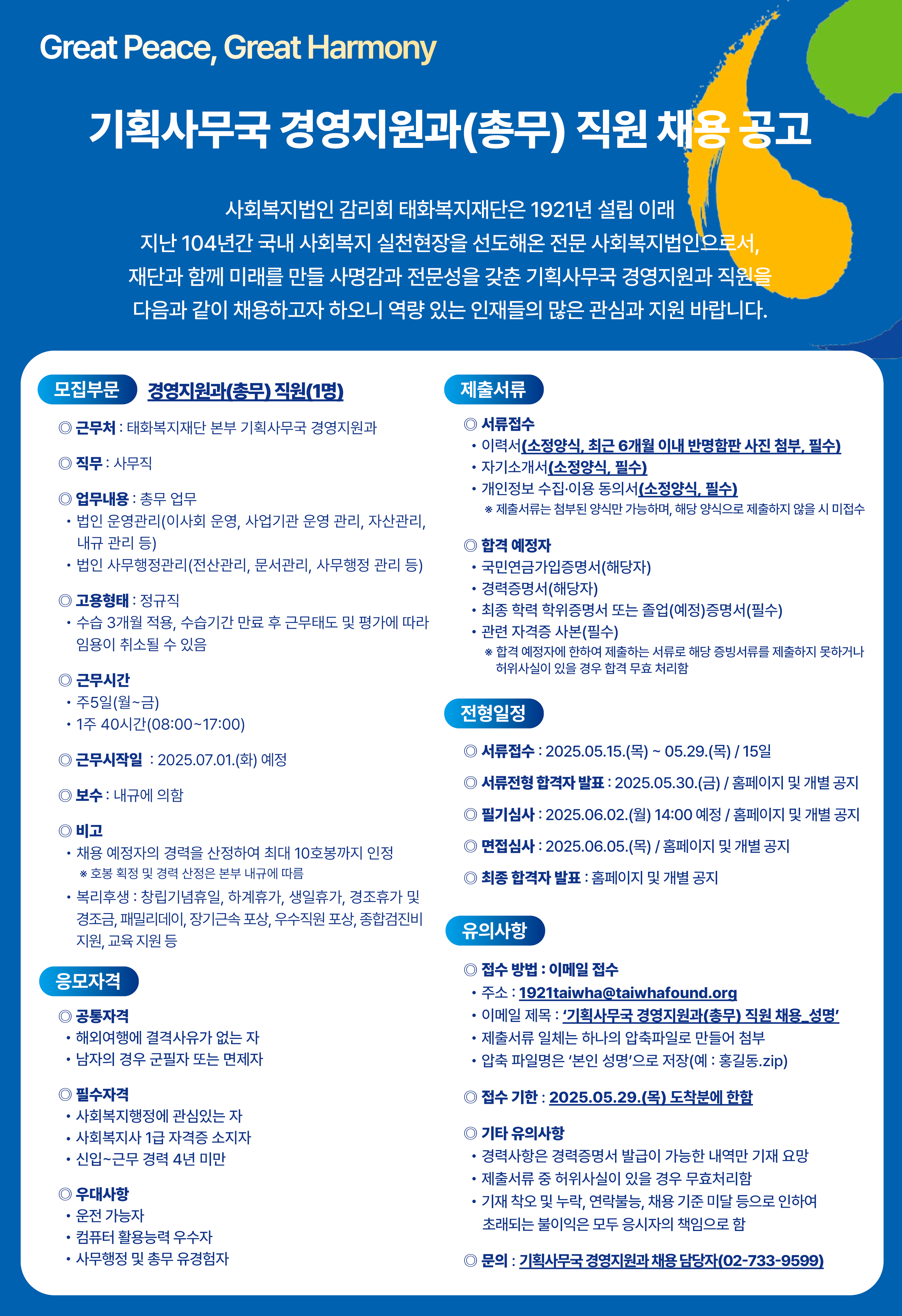 모집/직원채용 [태화복지재단] 기획사무국 경영지원과(총무) 직원 채용 공고 태화샘솟는집 2025. 5. 16. 09:33 1. 이력서.hwp 0.07MB 2. 자기소개서.hwp 0.03MB 3. 개인정보 수집 이용 동의서.hwp 0.03MB 저작자표시 비영리 변경금지 (새창열림)