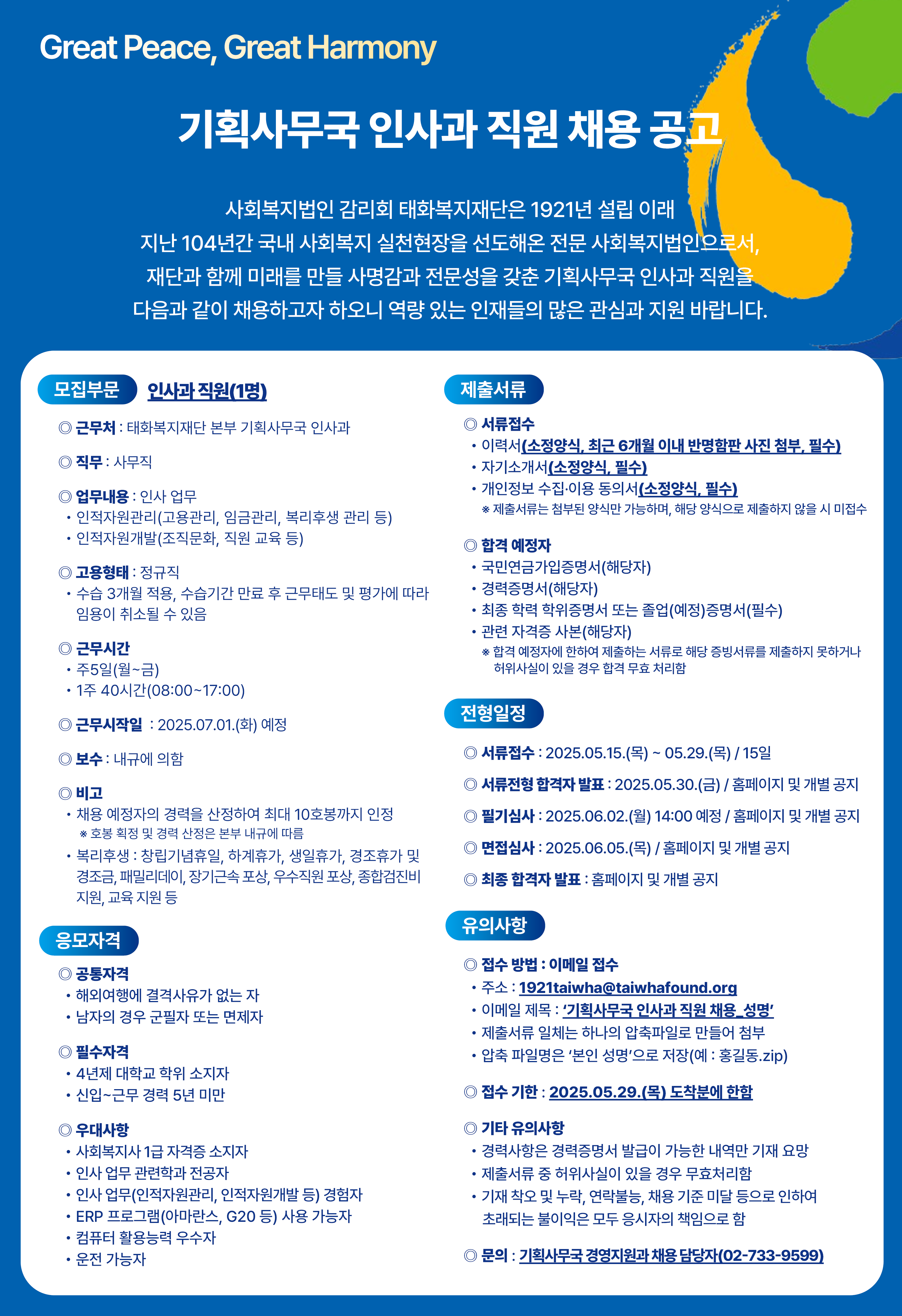 모집/직원채용 [태화복지재단] 기획사무국 인사과 직원 채용 공고 태화샘솟는집 2025. 5. 16. 09:36 1. 이력서.hwp 0.07MB 2. 자기소개서.hwp 0.03MB 3. 개인정보 수집 이용 동의서.hwp 0.03MB 저작자표시 비영리 변경금지 (새창열림)