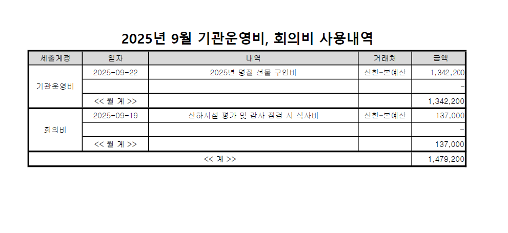 소식/공지사항 2025년 9월 기관운영비, 회의비 사용 내역 태화샘솟는집 2025. 10. 10. 17:08 2025년도 9월 태화샘솟는집 기관운영비, 회의비 사용내역을 공개합니다. 태화샘솟는집의 사업에 많은 관심 가져주셔서 감사합니다. 저작자표시 비영리 변경금지 (새창열림)