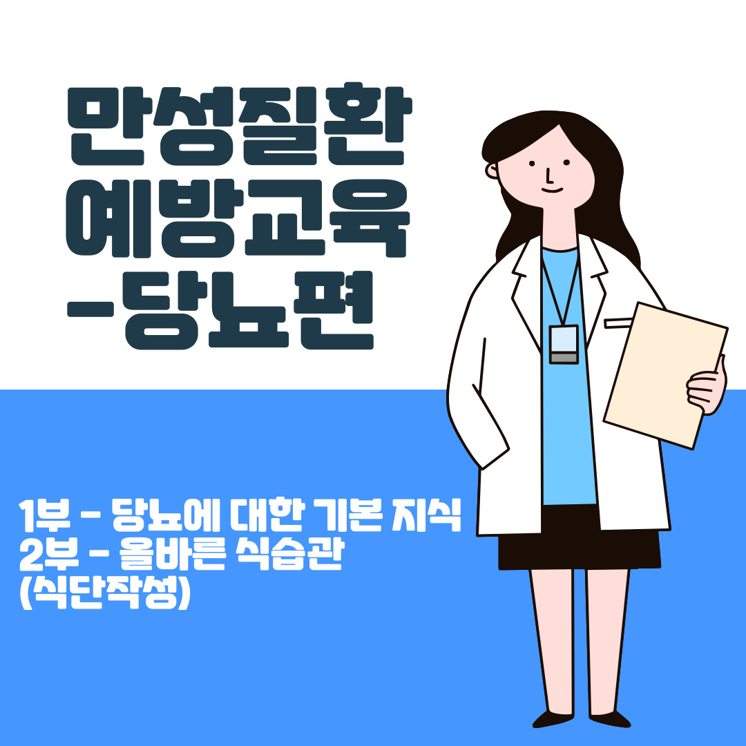 6월 14일 (수) 만성질환 예방교육 - 당뇨편 2023. 6. 14. 09:11 6월 14일 (수) 만성질환 예방교육 - 당뇨편 일시 : 6월 14일 (수) 10:00 - 12:00 장소 : 별관 1층 내용 : 당뇨에 대한 기본지식, 올바른 식습 공유하기 게시글 관리 태화샘솟는집 저작자표시 비영리 변경금지 (새창열림)